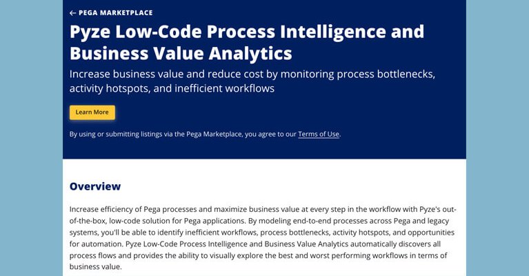Increase efficiency of Pega processes and maximize business value at every step in the workflow with Pyze’s out-of-the-box, low-code solution for Pega applications. By modeling end-to-end processes across Pega and legacy systems, you’ll be able to identify inefficient workflows, process bottlenecks, activity hotspots, and opportunities for automation. Pyze Low-Code Process Intelligence and Business Value Analytics automatically discovers all process flows and provides the ability to visually explore the best and worst-performing workflows in terms of business value.
