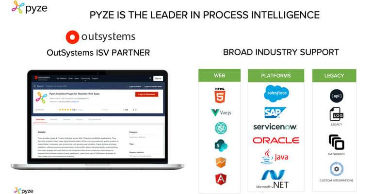 Pyze addresses the increasingly critical business needs to understand and optimize business process inefficiencies, increase the productivity of end-users, and continuously improve the applications on Outsystems. Pyze automatically maps process journeys and surfaces opportunities to optimize end-to-end processes as well as improve task-level user experiences. Key-value propositions include: